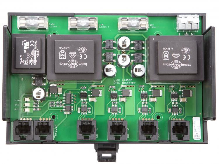 The 4 output DMX booster is a DMX amplifier—splitter for DMX signals on CAT5 utp cable and standard RJ45 connectors.
